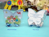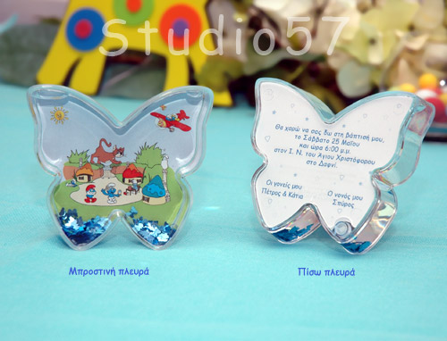 Προσκλητήριο βάπτισης χιονόμπαλα, σε σχήμα πεταλούδας με αστεράκια. |