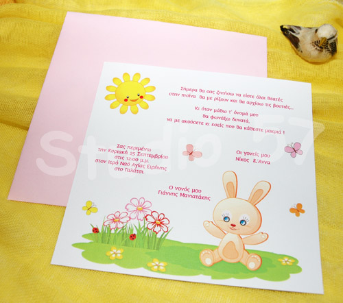 Προσκλητήριο βάπτισης λαγουδάκι. Κωδ. ΒΚ303