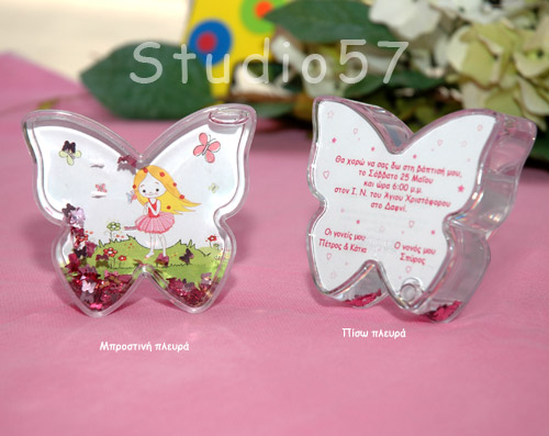Προσκλητήριο βάπτισης χιονόμπαλα, σε σχήμα πεταλούδας.